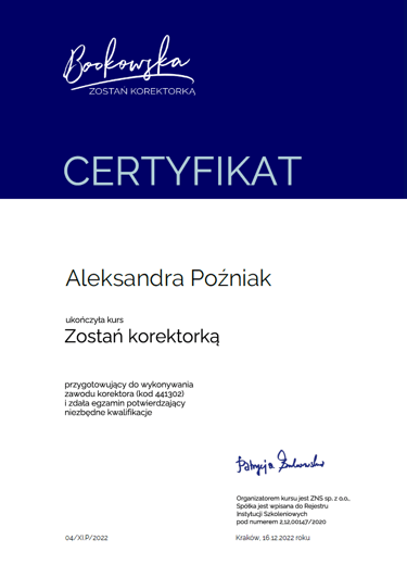 Z wykształcenia jestem kulturoznawczynią, dyplom magistry obroniłam na Uniwersytecie Wrocławskim. Pracy z tekstem i językiem uczyłam się podczas kursów